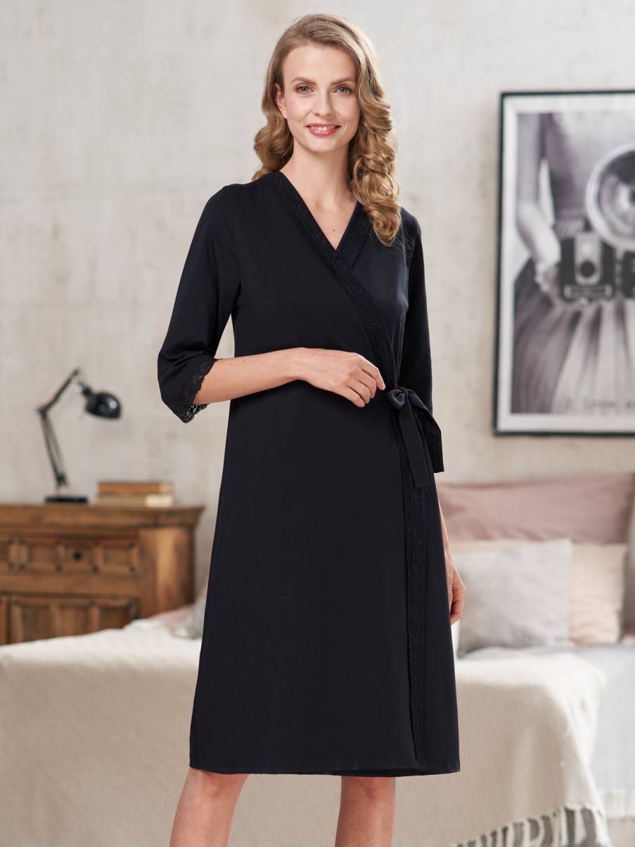 Халат имеет внутренние атласные ленточки, а внешний запах фиксируется при помощи трикотажных завязок в виде банта.